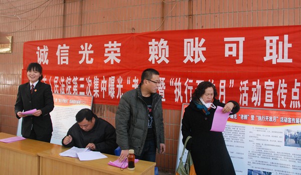 图为11月28日,卫辉法院在开展集中暴光“老赖”暨“执行开放月”活动中,法院干警走向街头,为群众送法讲法。