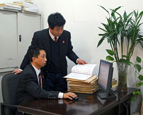 图为卫辉市法院审管办工作人员利用案件流程管理软件对临期案件跟踪管理。