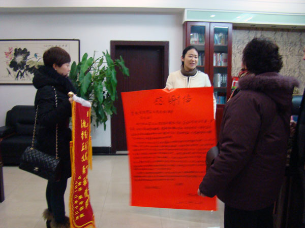 “谢谢你们,感谢你们为我已逝的亲人讨还公道,使我们有了活下去的信心和勇气”。1月15日,雾霾天气依旧,寒气更加逼人,可当事人郭某的家属心里却是热乎乎的,她们手持“执法为民一生正气维护正义两袖清风”的锦旗和一封感谢信早早地等候在牧野区法院门口,上午8:00她们亲自将锦旗和感谢信交到院长耿梅红的手中,激动地说。