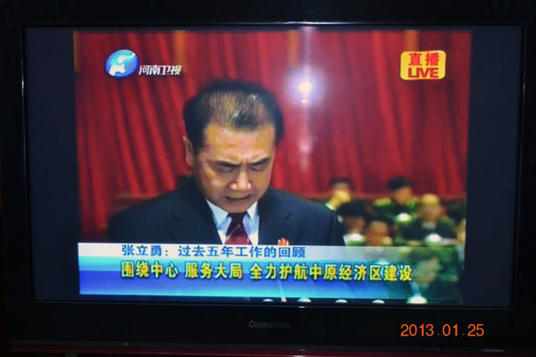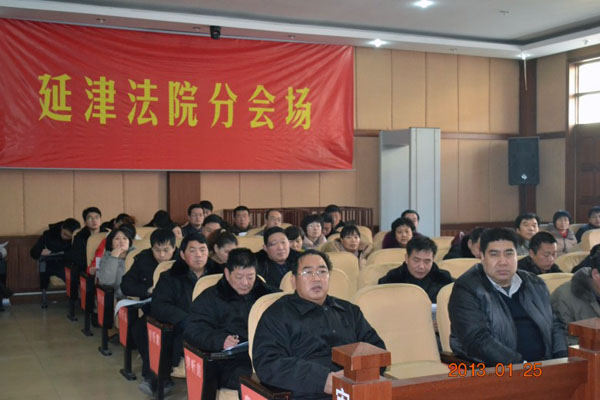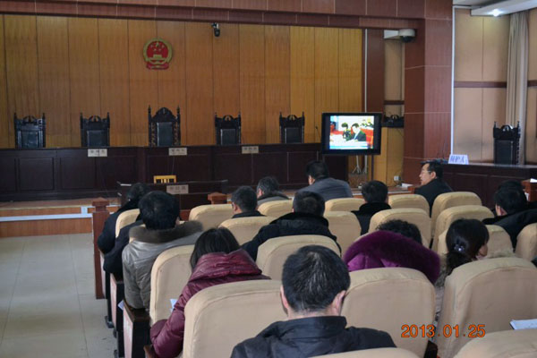 2013年1月25日上午9时,延津县人民法院组织全体干警在大审判庭收看张立勇院长在河南省人大十二届一次会议第三次大会上作全省法院工作报告的实况直播。