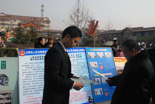 3月5日清晨,卫辉法院志愿服务者带着展示牌、宣传页来到老体育场做准备。没过多久,站牌前陆陆续续出现了驻足的群众,有的观看展牌上一个个未成年如何走向犯罪的案例和如何预防未成年犯罪的温馨提示,有的向志愿服务者询问有关法律知识。在这里他们感受到了法院干警的热情服务和周到的解答,他们纷纷表示法院干警不仅为他们答疑解惑而且提供实实在在的帮助,他们感到很温暖。