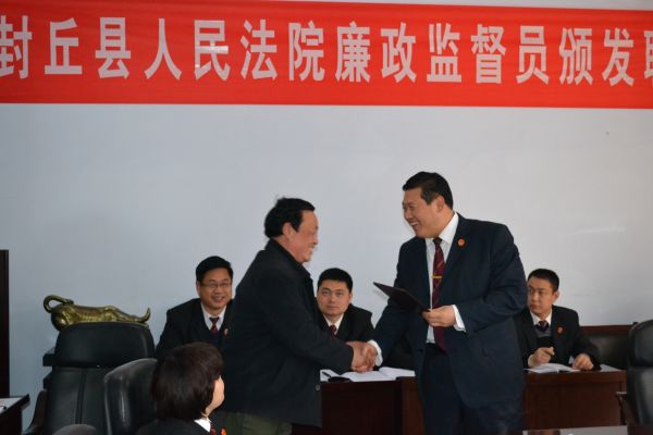 为进一步加强法院廉政监督工作,拓宽社会监督渠道,促进公正廉洁文明执法,3月13日,封丘法院在三楼会议室举行了廉政监督员聘书颁发仪式。全体党组成员和中层正职以及受聘的十一名廉政监督员参加了聘书颁发仪式。聘书颁发仪式由院党组副书记、副院长薛东旺主持。