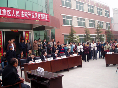 5月5日,河南省红旗区人民法院开发区法庭到辖区东台头村委会公开审理一赡养案件。开庭前村委会大院里就陆续来了二、三百名旁听群众,大家里三层外三层,连审判台后面都站满了人,新乡电视台法制频道的记者也闻讯赶到开庭现场,当审判长宣布开庭后,现场的秩序安定下来。