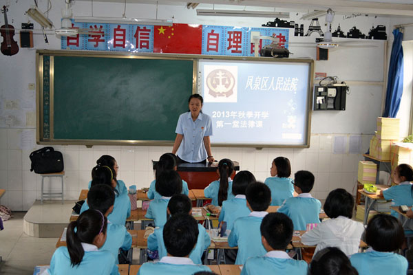 9月2日上午,是全市中小学开学第一天,新乡市凤泉区人民法院法官走进新乡市第十一中学,为该校初二年级讲授“2013年秋季开学第一堂法律课”。图文并茂、案法结合的多媒体授课方式,真实感人的法制微电影让这堂课上得丰富生动。课堂上,每位同学还收到了一份礼物——法律漫画读本《成长路上我们与法同行》,让孩子们通过精美有趣的漫画了解法律,进一步增强法律意识。