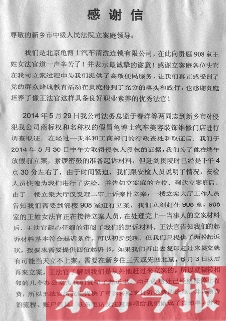8日上午,记者到新乡市中级人民法院参加一个活动时,看到一封加盖有北京龟博士汽车清洗连锁有限公司公章的感谢信。感谢信说,5月30日下午4时30分,该公司法务总监于春洋到新乡市中级人民法院,准备起诉新乡企业侵犯该公司商标权和名誉权。 一位王姓女法官耐心审阅起诉材料后,告知可以初步受理。按规定需要四份起诉书,但于春洋只提供了两份。了解到于春洋从外地赶来,王法官主动去邻近办公室帮他们复印了起诉书。为免去当事人来回奔波缴纳诉讼费,王法官告诉当事人,可以转账支付,并将缴费流程注意事项做成告知单,耐心讲解告知。“如果我们出去复印再赶回来,法院可能就下班了。当天立不上案,就要在新乡住三天或先回北京,等(端午)节后再来立案。”于春洋昨天接受东方今报记者采访时说,当时他们非常着急。“复印材料,并不是王法官的工作内容,但她主动做了。当时我们非常感动,说句实在的,想哭的心都有了。”于春洋说,“能真正做到从当事人的角度考虑,急当事人之所急,为当事人最大化节约时间和经济成本,真正做到了为当事人服务。”