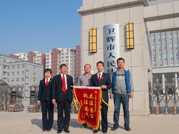 11月14日,两行政案件当事人从河北驱车来到卫辉市人民法院,将一面写有“立法为公 执法为民”的锦旗送到该院行政庭法官手中,对法官们牺牲周末休息日时间耐心细致地协调案件表示感谢。