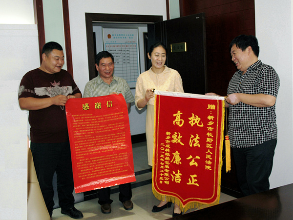“贵院的李明等两位法官认真敬业、不辞辛苦、不计回报,为我公司挽回了巨额的经济损失,充分展示了牧野法院法官优良的工作作风和良好的职业素养,展现了新时期法官的风采,在此,我特地向贵院表示最诚挚的谢意!”7月29日上午,市人大代表、新乡市成林纸品包装有限公司董事长张文新带领公司相关人员专程到牧野区法院送上锦旗和感谢信,并向该院院长耿梅红表示了真诚的谢意。