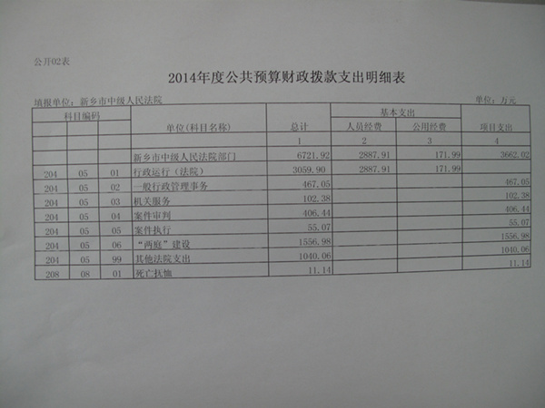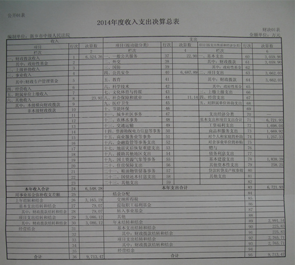 河南省新乡市中级人民法院2014年度的预算执行按照新乡市财政局批复的部门预算进行,编制的决算符合国家有关法律法规、规章制度要求,总体规范、真实、合法。