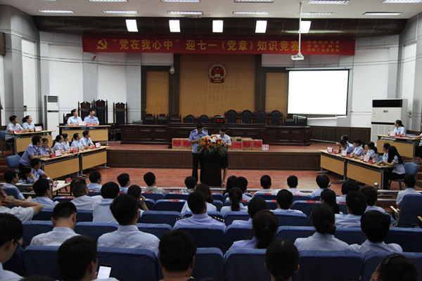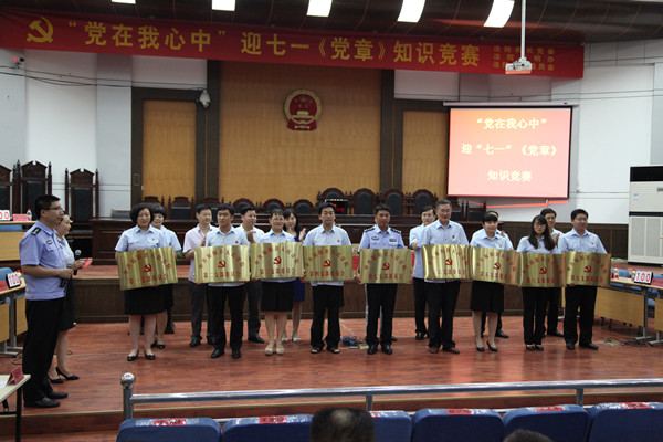 活动最后举办了题为“党在我心中”的党章知识竞赛。全院除老干部支部以外的九个党支部均选派代表参加。这次竞赛以党章知识为主要内容,题型为选择、判断题,分抢答、必答及现场互动三个环节进行。整个竞赛过程中,参赛选手团结协作,踊跃答题,整场竞赛紧张激烈,全面展现了新时期党员干部和法官蓬勃向上的时代风采和精神风貌。最后经过各个环节的层层比拼,以支部为单位评出了一等奖1名、二等奖2名,周化冰院长及受邀领导上台为获奖支部颁发了证书和奖品。