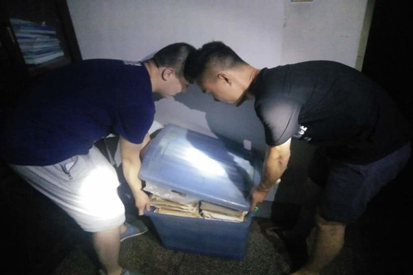 沈志勇局长与行政科科长郭徽等五人冒着风雨将院内重约500公斤的安检机及安检仪、安检门、叫号机等设备从积水中转移到安全地带,及时保住了公共财产安全。